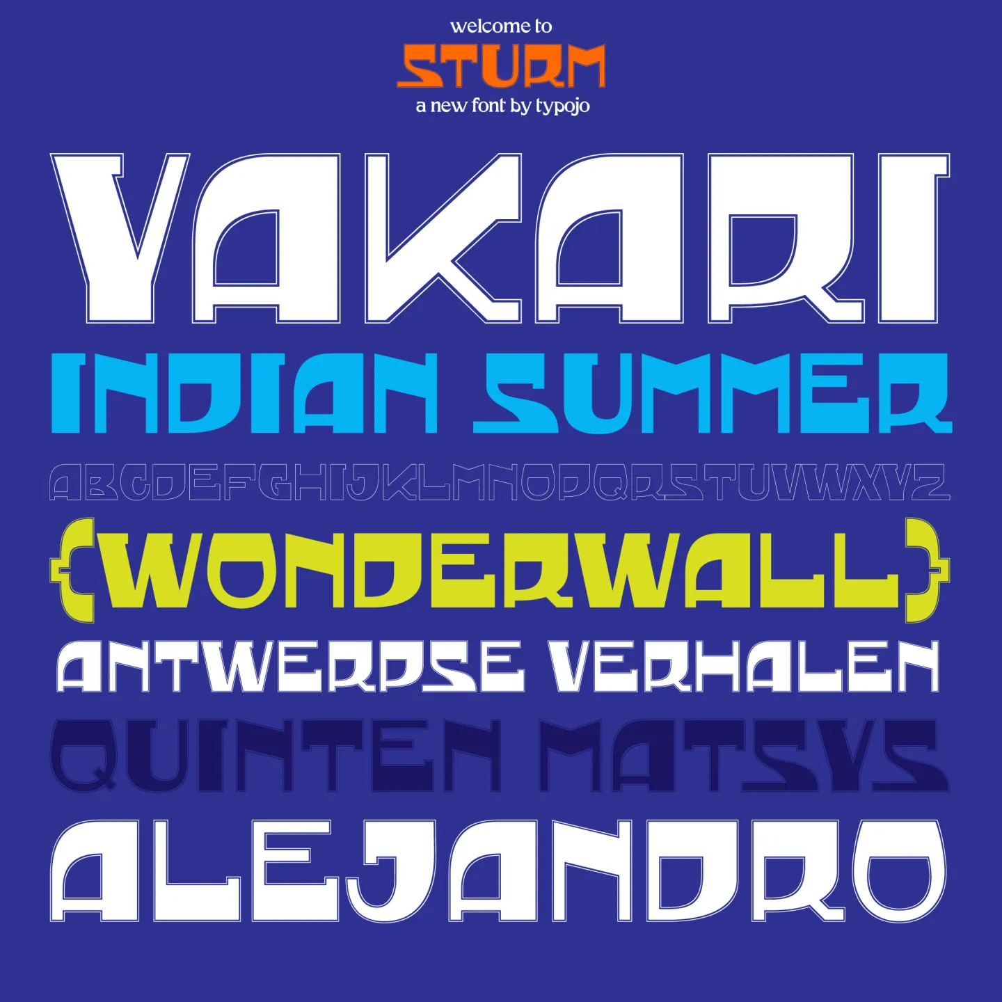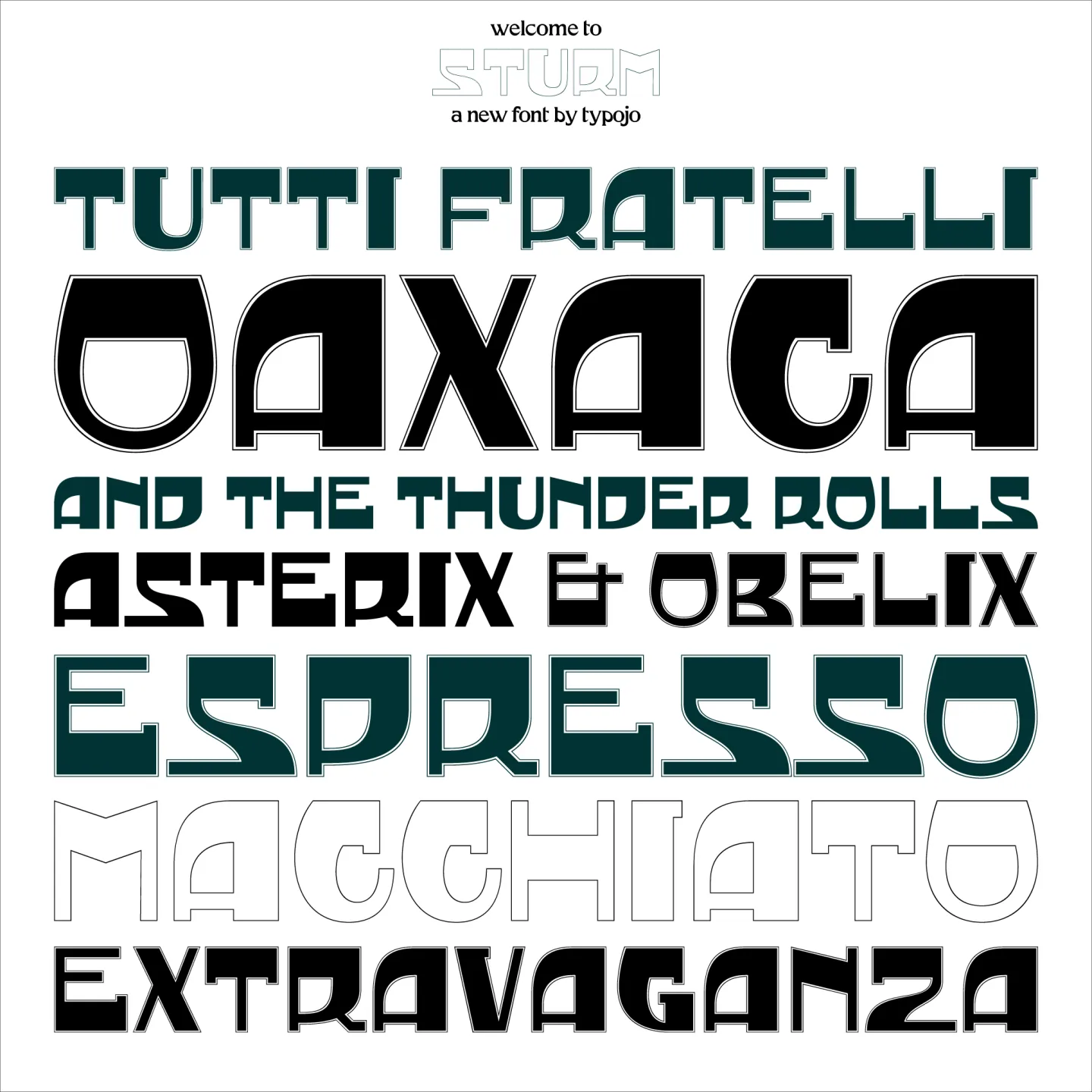 Sturm is a display typeface in the art deco style, and features solid geometric characters with a light border. Each capital is executed in four ways: the original design, an outline version, the separate inner shape, and the inner shape aligned to the baseline and capheight. This makes Sturm very suitable for logo’s, editorial & poster design, advertising, branding and packaging design.