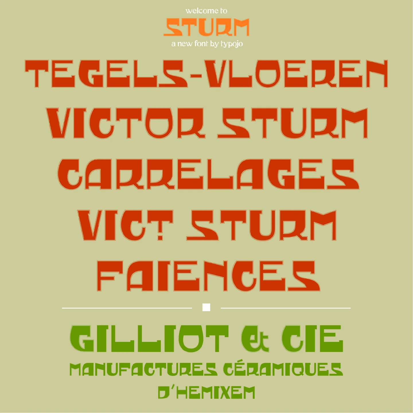 Sturm is a new original font from @typojo inspired by the architectural lettering on the glazed mosaic tiles of the Victor Sturm building at the corner of ‘Oever’ and ‘Steegsken’ in Antwerp (Belgium). These tiles were most likely crafted by Gilliot & Cie, Manufactures Céramiques d’Hemixem, one of Sturm’s main suppliers.